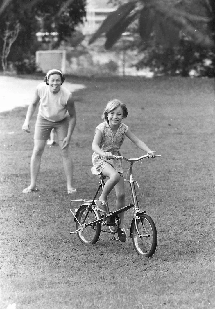 Fast forward a month or so and Mom and Connie were spending Mother’s Day with Jeff and I at our cabin in Hayward—one of many wonderful weekends we spent together there. It wasn’t until the drive home that Connie remembered the newspaper, and she swung into a store in town and there—right above the masthead—was a picture of Mom teaching me to ride a bike.
